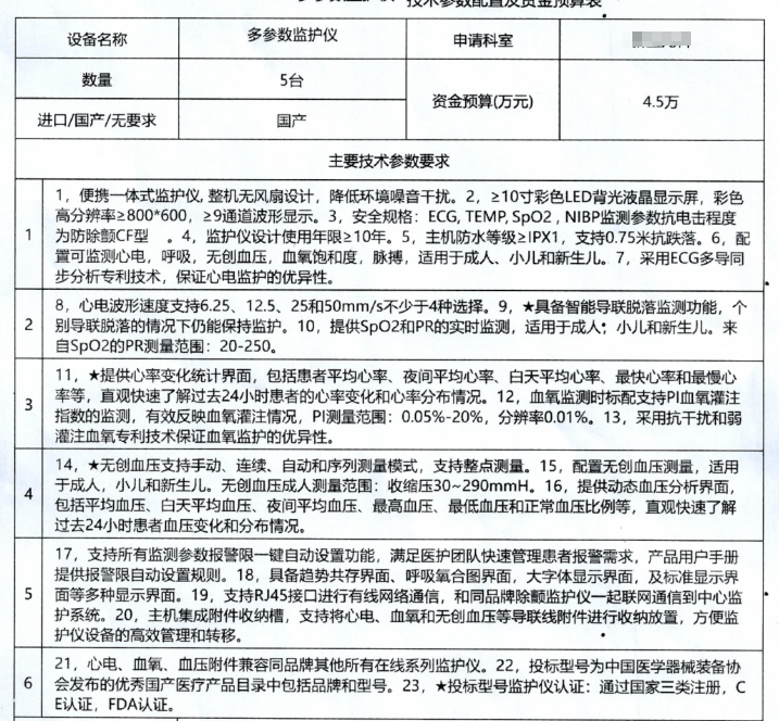 1 | 多参数监护仪 | 5 | 台 | 总计:42500 | |